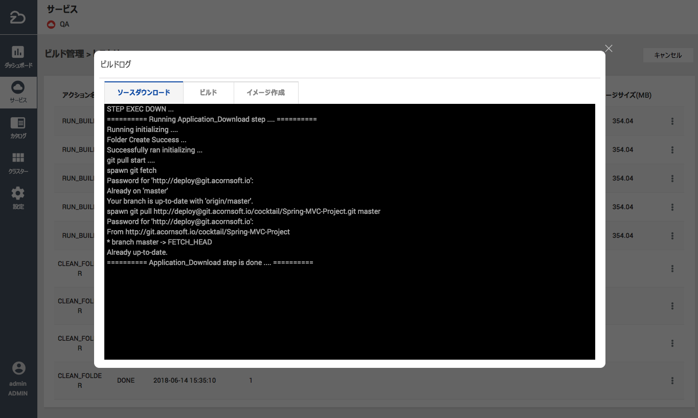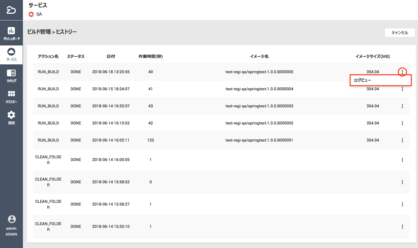 b) ビルドタスクヒストリーメニューで、 該当ビルドタスクのアクション名、 ステータス、 日付、 作業時間、 イメージ名、 イメージサイズ、 ログビューを確認