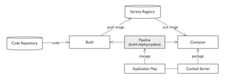 ビルドされたイメージは、カクテルサーバーのコンテナとしてローリングアップデートする。ビルドで作られたイメージには自動的にビルド番号が付与され、これによって最新バージョンまたはロールバックを実行する。