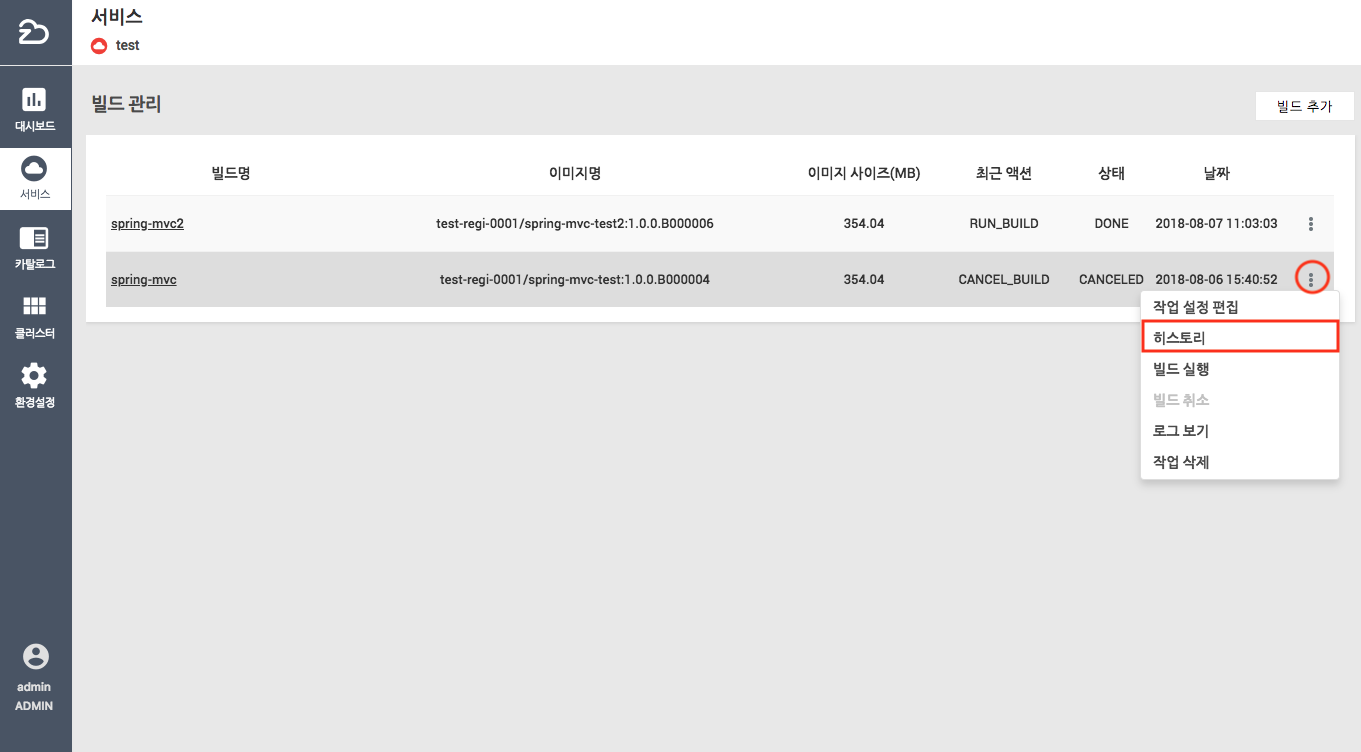 b) 빌드작업 히스토리 메뉴에서 해당 빌드 작업의 액션명, 상태, 날짜, 작업 시간, 이미지명, 이미지 사이즈, 빌드 로그를 확인