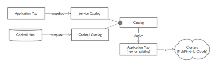 - Cocktail Catalog : 칵테일 클라우드에서 “칵테일 허브”를 통해 제공되는 런타임 템플릿을 말한다. 사용자는 템플릿을 그대로 또는 자신의 환경에 맞게 설정을 변경하여 배포 할 수 있다. 현재 칵테일 카탈로그는 DB, 미들웨어, 개발/운영 도구, 블로그, 머신러닝 등 널리 사용되는 오픈소스를 템플릿으로 제공하고 있으며, 지속적으로 업데이트하고 있다.